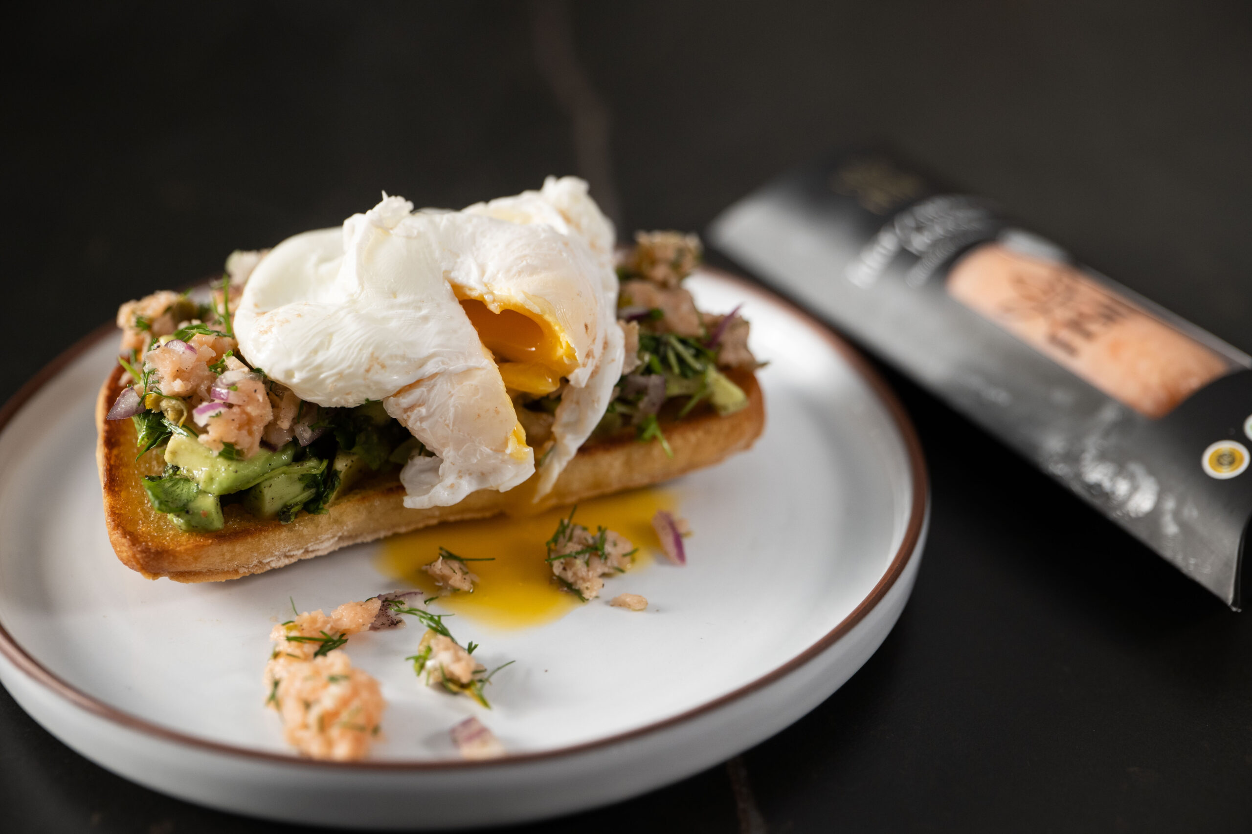 Na talerzu układam grzankę. Na górę przekładam awokado oraz tatar. Na koniec wkładam jajko w koszulce.